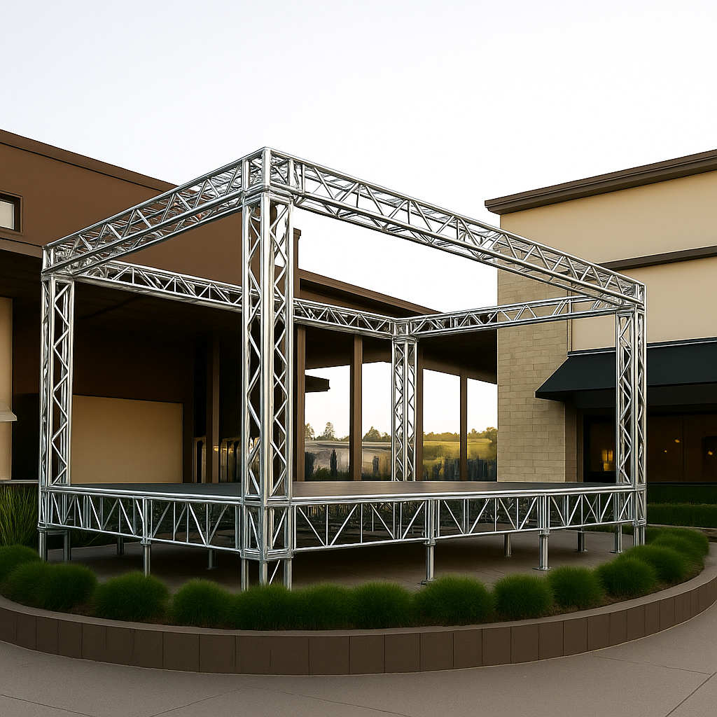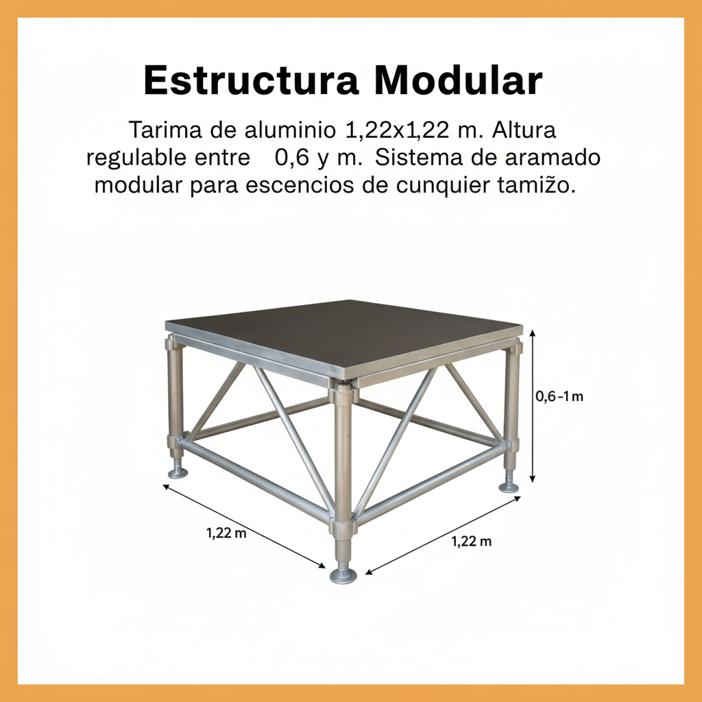 Tarimas modulares de aluminio 6082-T6 de alta dureza, diseñadas para escenarios profesionales, ferias y montajes permanentes.