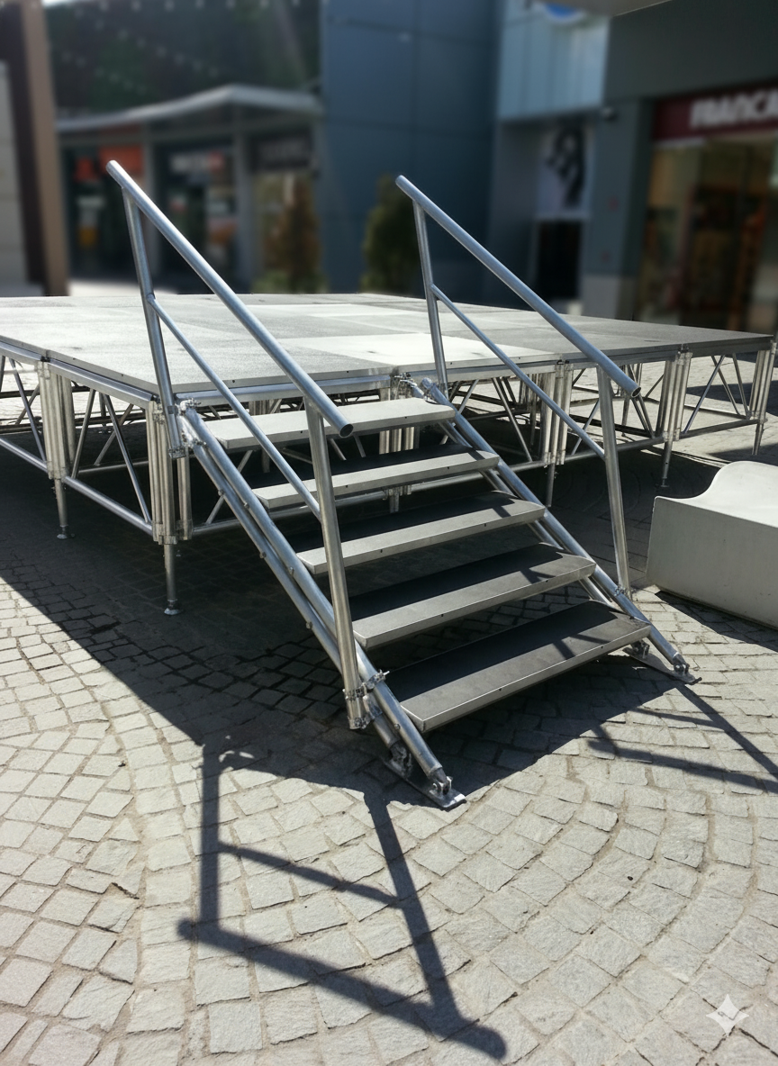 Escaleras modulares en aluminio 6082-T6 de alta dureza, compatibles con plataformas ST3 y sistemas de escenario modular.